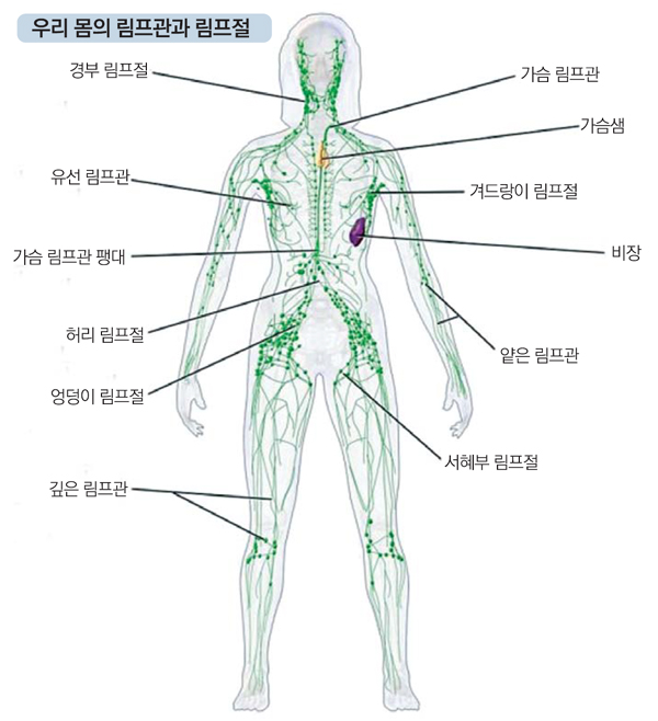 림프절은 몸 전체에 여러 곳 분포되어 있으며