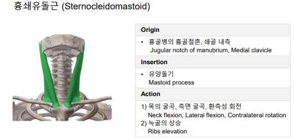 정지점인 유양돌기가 기시점인 쇄골과 흉골 쪽으로