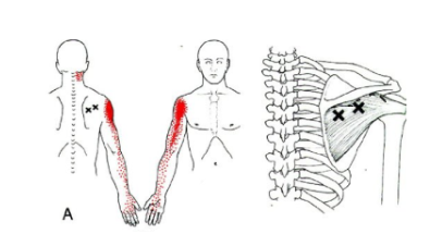 극하근에 통증 유발점(Trigger Point, TP)이 있을 경우 외전 및 외회전이 제한됩니다.