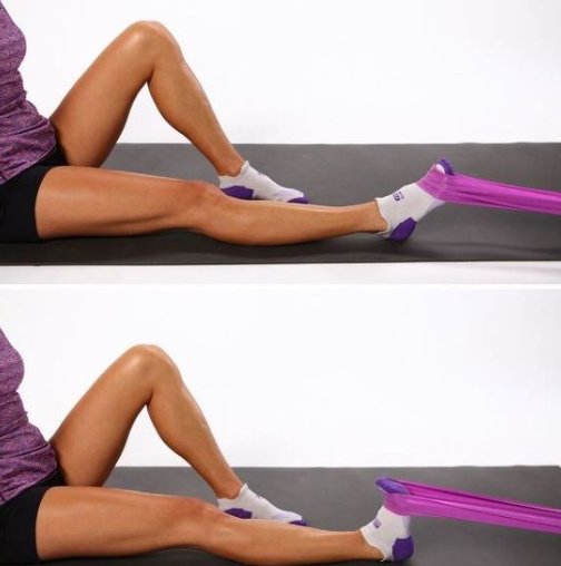 밴드를 발바닥에 걸고 양손으로 잡은 뒤, 숨을 내쉬며 발로 밴드를 밀어내며 발목을 앞으로 뻗는다.