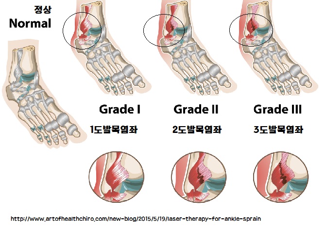 발목 염좌는 인대 손상 정도에 따라 다음과 같이 구분된다.