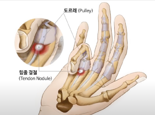 이로 인해 통증이 생기고, 손가랑이 잘 펴지지 않는 증상이 나타납니다.