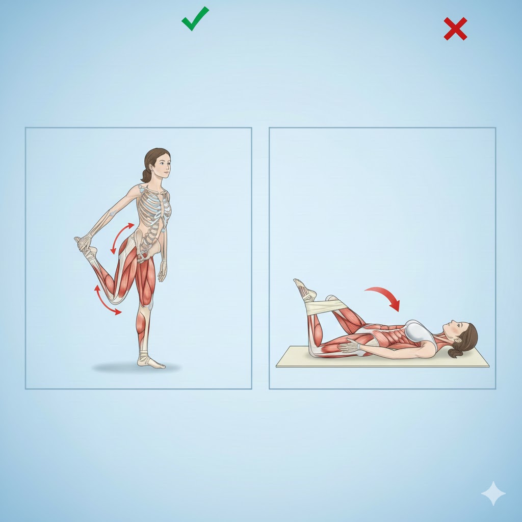 방법: 선 자세 또는 엎드린 자세에서 한쪽 다리를 구부려 발끝을 잡고, 무릎을 바닥 방향으로 밀어 허벅지 앞부분을 충분히 늘려준다. 서 있는 다리의 무릎을 살짝 구부려 중심을 잡는 것이 중요하다.