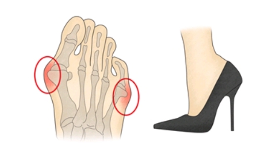 굽이 높은 신발이나 앞코가 좁은 신발을 자주 신는 여성에게서