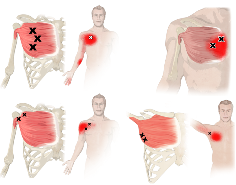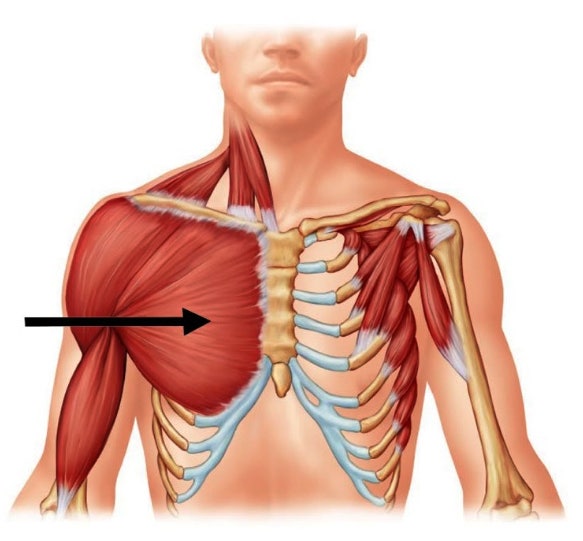 흉골(가슴뼈), 쇄골, 갈비뼈 일부에서 시작해 상완골(팔뼈)에 붙어 있다.