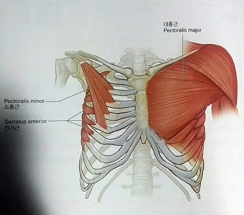 가슴부터 겨드랑이까지를 구성하는 대표적인 근육은 대흉근과 전거근이다.