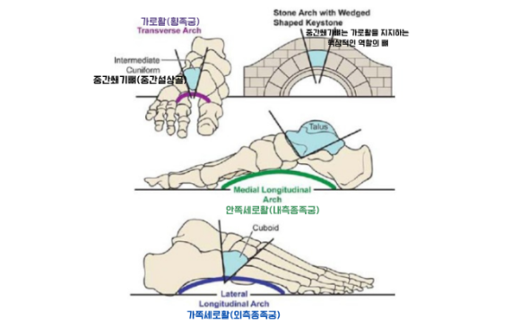 특히 발의 구조에서 핵심적인 요소는 ‘아치(arch)’다. 발의 아치는 안쪽 세로 아치, 가쪽 세로 아치, 가로 아치로 구성되어 있으며, 체중을 분산하고 탄성 있는 움직임을 만들어내는 기능을 한다. 이 구조가 무너지면 충격 흡수 능력이 저하되고, 보행 패턴과 자세 전반에 변화가 발생할 수 있다.